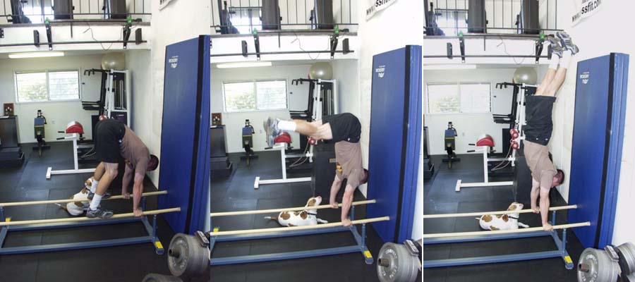 Loyd Lewis performs the stiff-stiff (straight arm – bent hip – straight leg) press to a handstand. This is the first press of merit. Learn with the straddle and without. Done slowly, with control, and powerfully, this press is one of the most amazing displays of balance and power in sport. Work this press from the floor and parallettes.