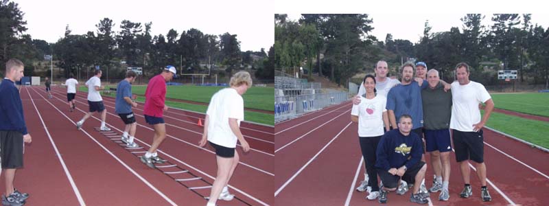 Matt Mast, CrossFit's running coach and athlete extraordinaire, takes "Team 6" (the 6 A.M. crew) through some agility/running skills and drills. Matt Mast (5'6" 160 lbs.) with a 200+ lb Clean & Jerk and 300+ bench press is our kind of runner. We'd lost Matt to U.C. Davis for four years but Team 6 is talking about sending him back for graduate work - in anything, anywhere.
