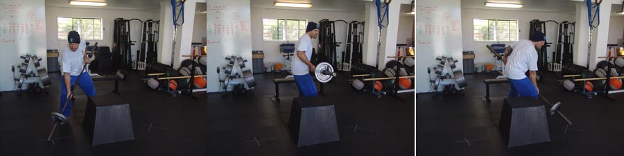 Doug demonstrates "indoor shoveling" with an Olympic bar and a 25 pound plate on one end.