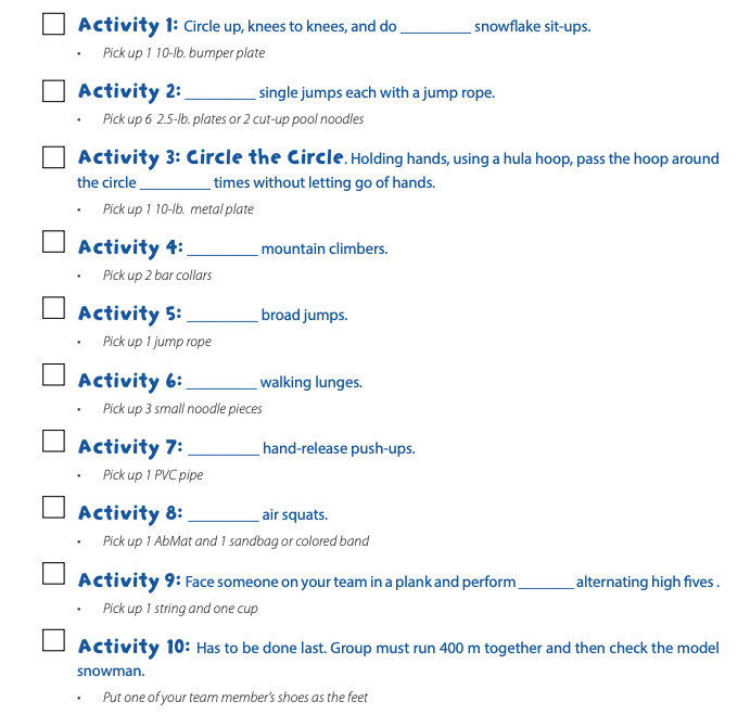 - For preschoolers, build the snowman as a whole class so everyone feels a sense of accomplishment. Assign a trainer or assistant to each team to read and check off movements and count reps.