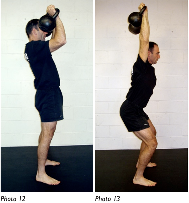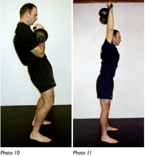 - Powerfully push the floor away, extending your legs and hips, and open your chest. It is this explosive movement that will propel the kettlebells overhead. Note that the legs will then straighten powerfully, but there is no rebend, or “double dip,” in the push press when you drive the kettlebells overhead (photo 11).