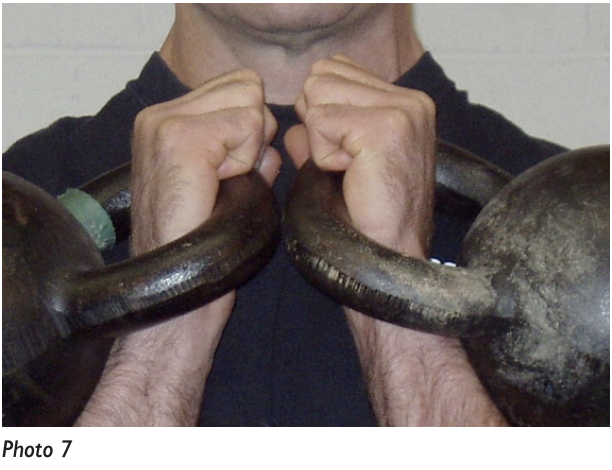 Caution: It is imperative that you unwrap and tuck your fingers as the kettlebells reach the rack position (photo 7). If you forget, it will be a “self-correcting,” since tucking your fingers will keep them from accidentally getting crushed between the two handles. Trust me, it will only happen once!