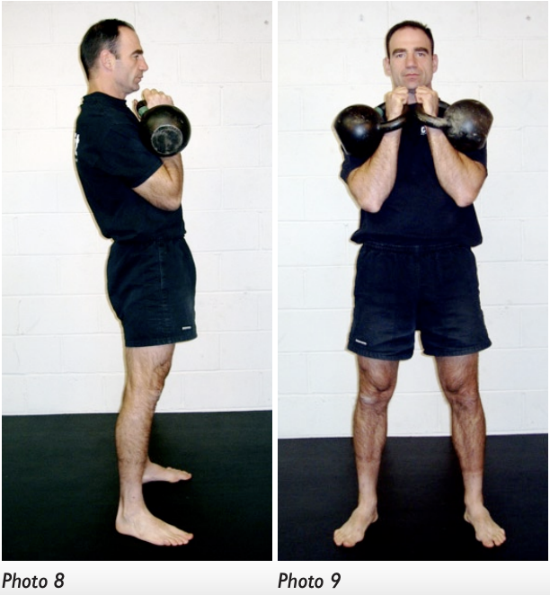 - Start by cleaning two kettlebells to the rack position (photo 9).