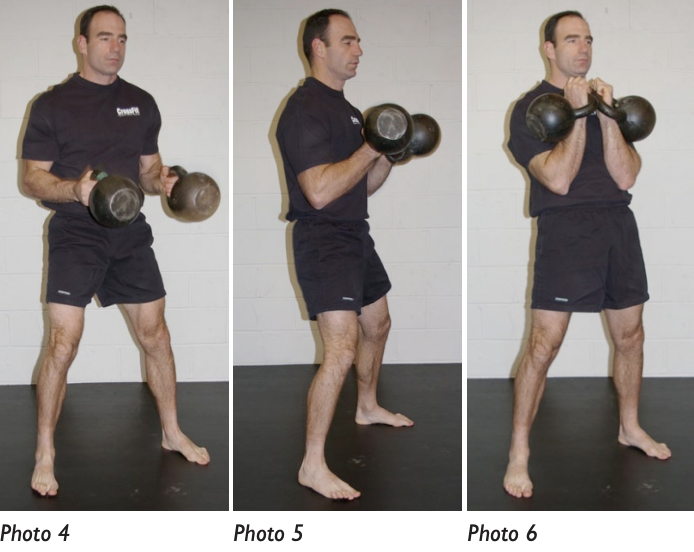 - Once the kettlebells reach the back end of the arc, explosively extend your knees and hips to drive the kettlebells forward and up, cleaning them to the rack position (photos 4, 5, and 6).