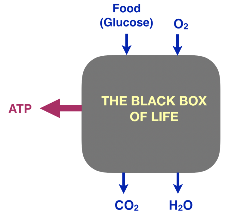 Regarding energy metabolism, we all know the basic idea: For humans, food and oxygen are taken in, water and carbon dioxide are expelled, and somehow the transformation provides energy for life processes. Graphically, consider the “black box of life,” and for simplicity, focus on glucose. In a black-box or “systems” approach, we look at inputs and outputs and see what we can learn under conditions where we don’t have enough information about mechanism.