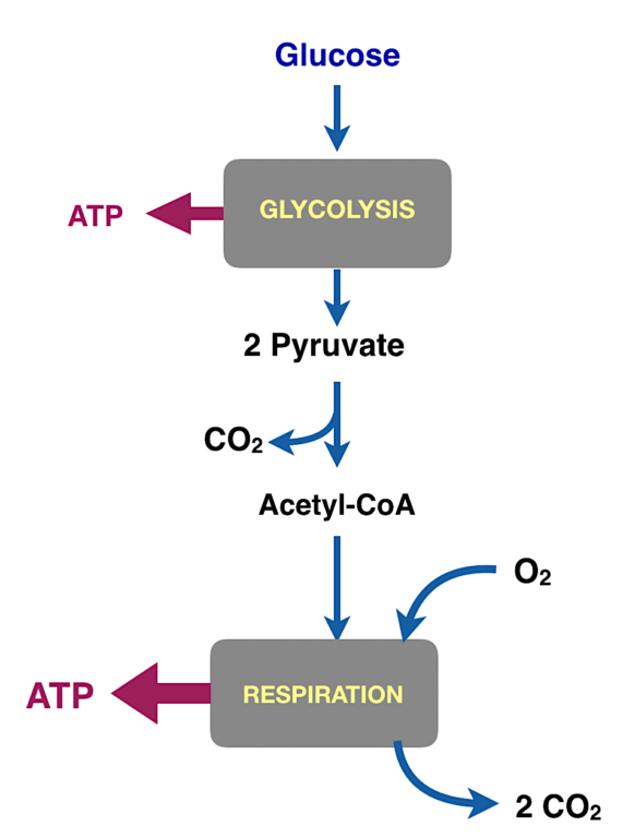 Figure 2: The major processes in energy metabolism. Glycolysis (glyco-, sugar; lysis, cutting) converts the six-carbon compound glucose into two molecules of the three-carbon compound pyruvate. Pyruvate is converted to a derivative of acetic acid called acetyl-CoA.
