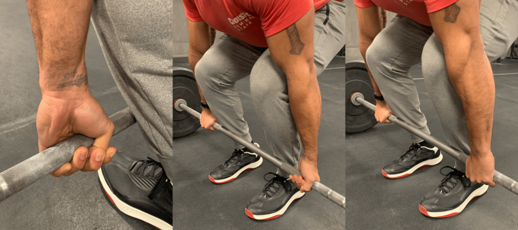- The bar starts at mid-shin with the athlete gripping the bar outside the shins and the bar in contact with the body.