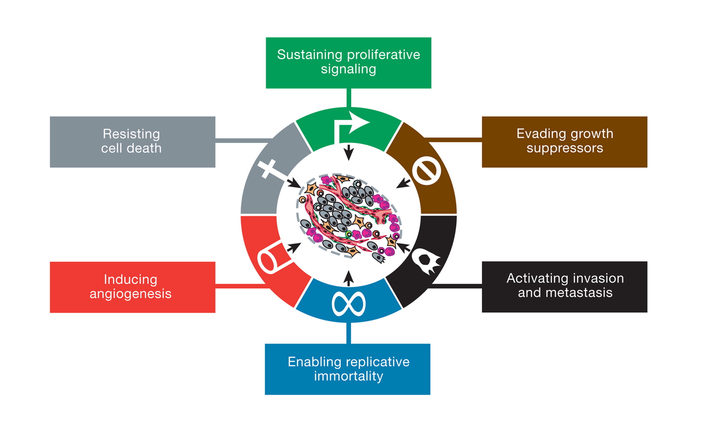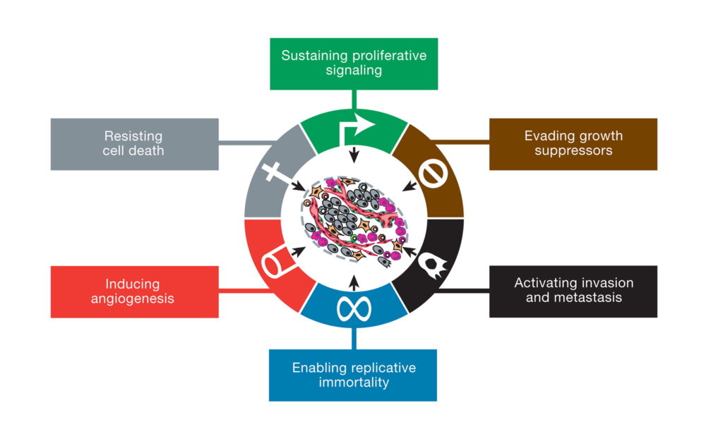 This illustration encompasses the six hallmark capabilities of cancer, originally proposed in 2000 and since substantiated with metabolic underpinnings. From (2).
