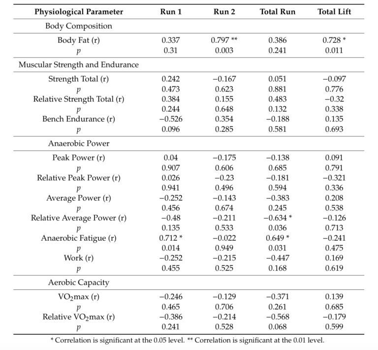 Taken together, these results suggest body fat content and tolerance of anaerobic fatigue are the clearest determinants of Murph time within this small sample. Previous research across varied exercise disciplines has found a correlation between reduced body fat and increased performance (2). It is reasonable to expect this relationship to be even stronger within the context of Murph, given it consists entirely of body-weight exercises.